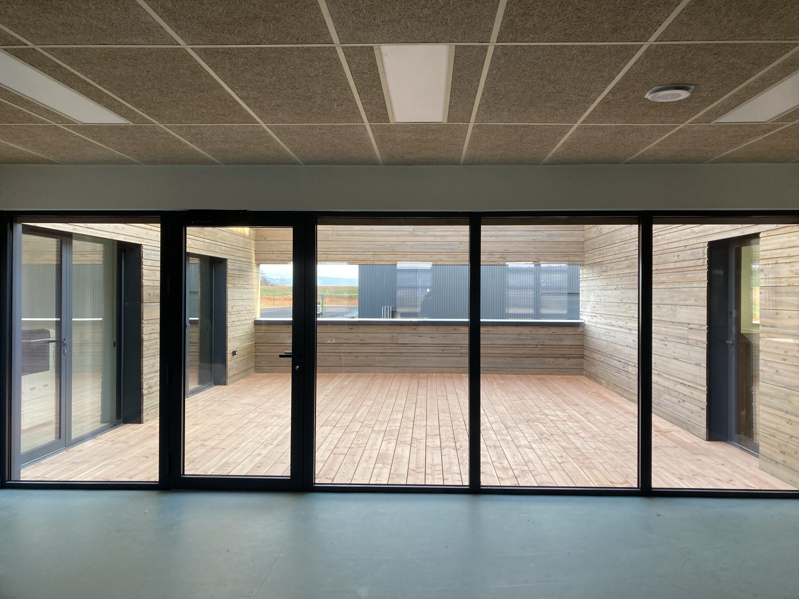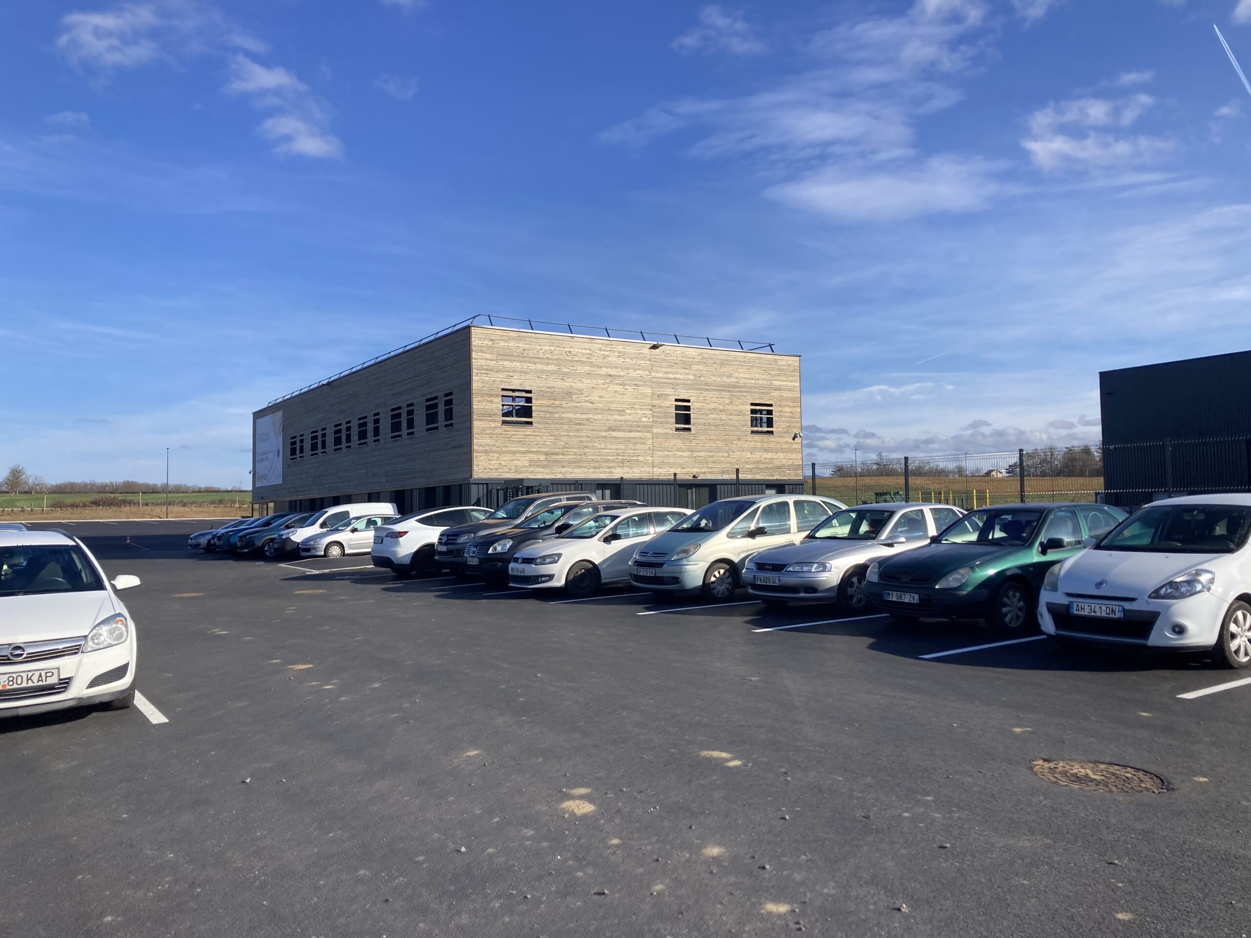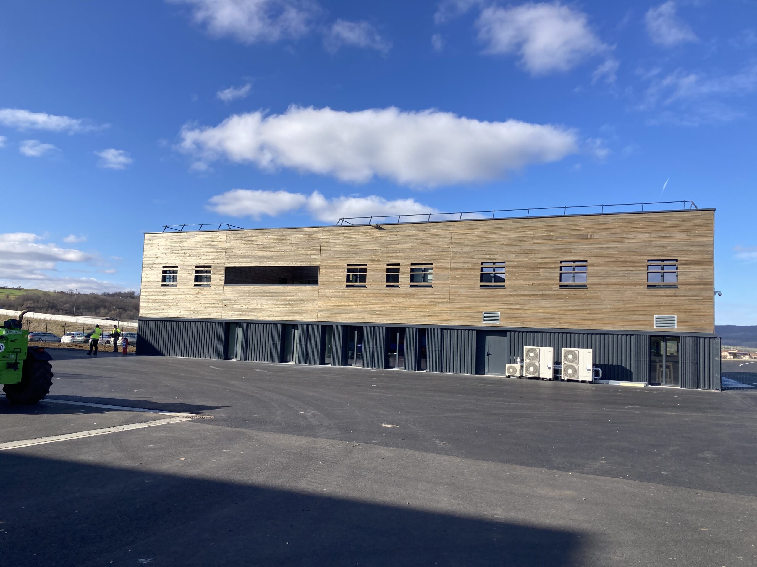 Structure: poteau béton, charpente bois, enveloppe métallique et bardage bois pour les bureaux.