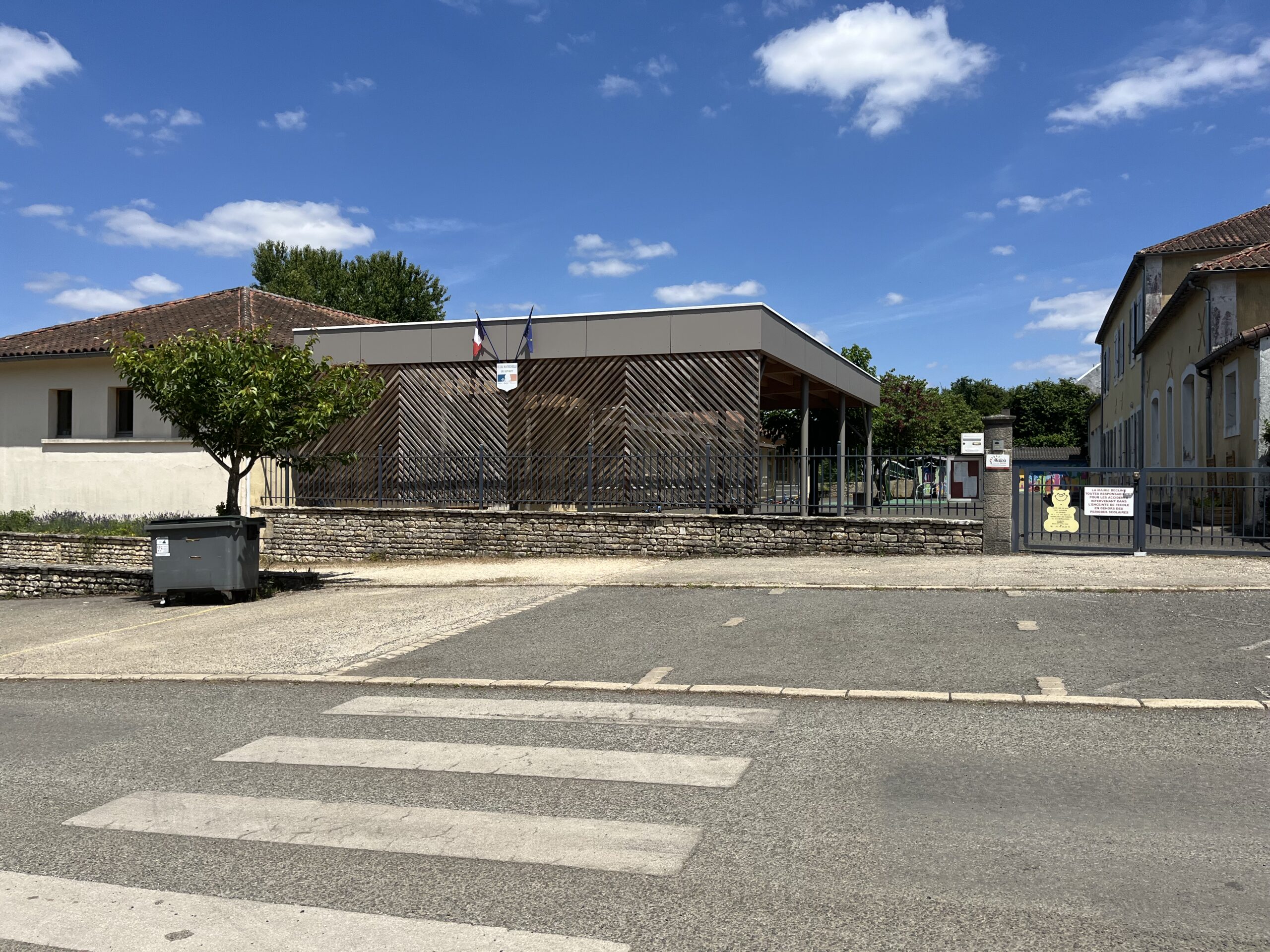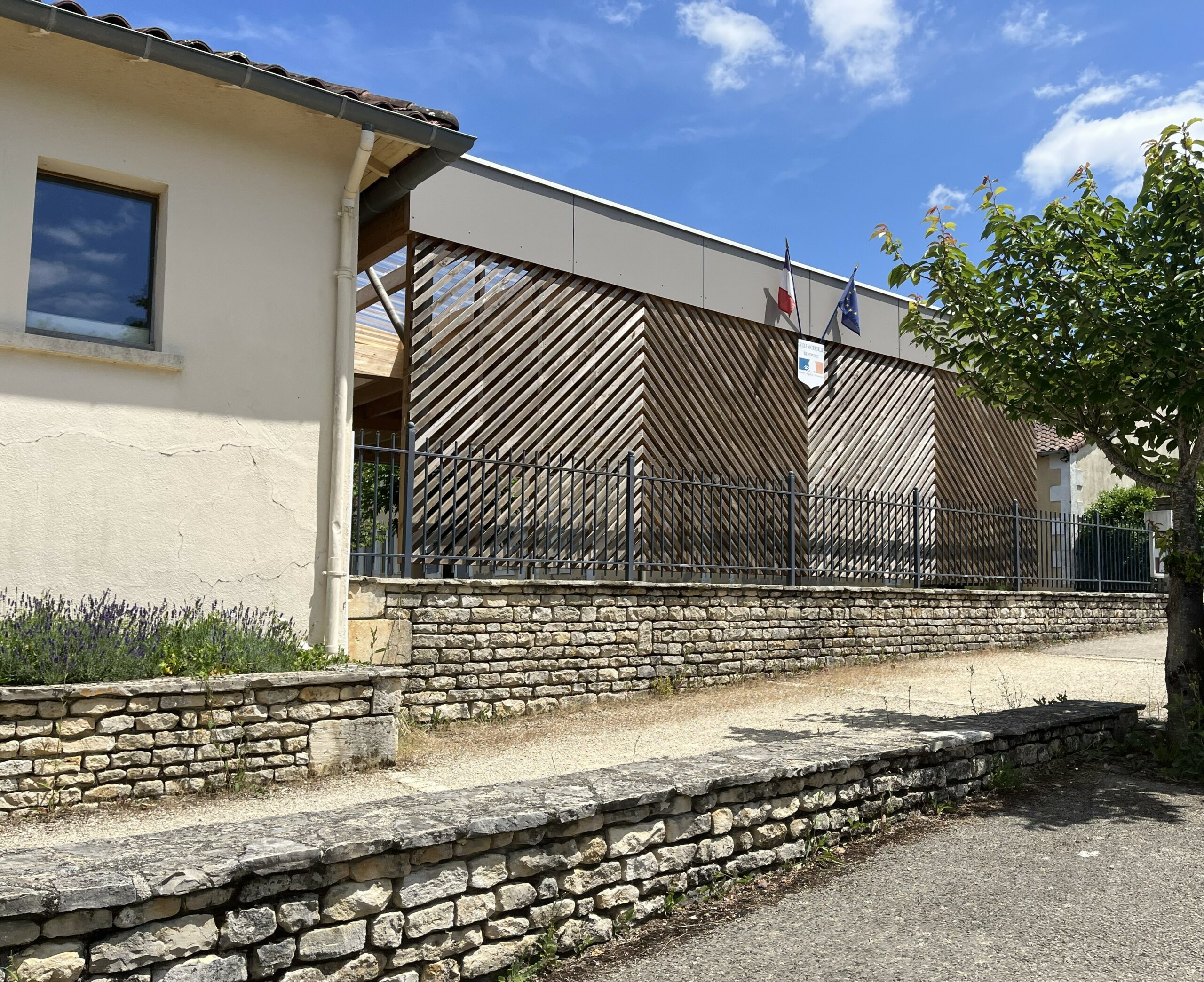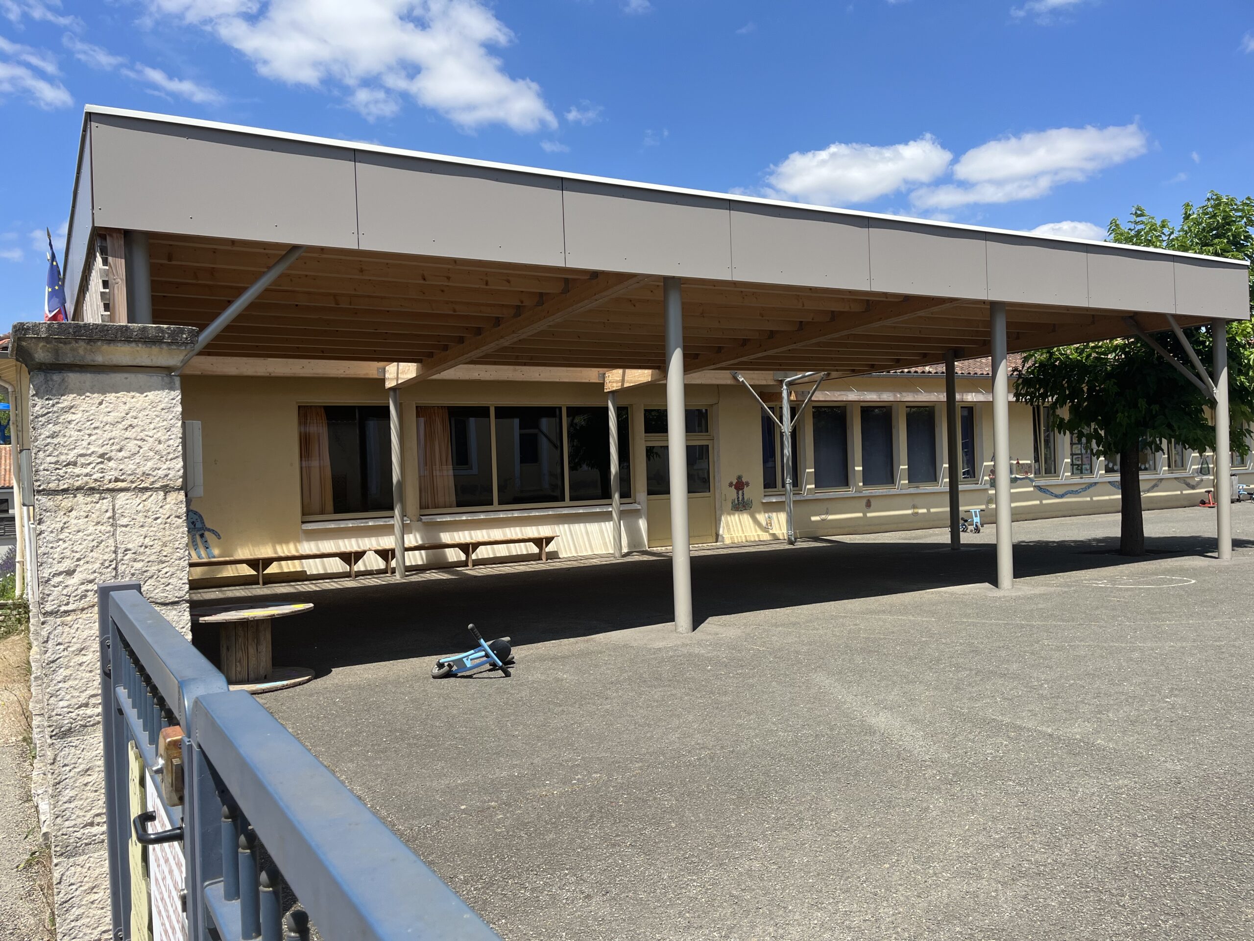 Matériaux  / Le préau est en structure métallique et en charpente bois. Il est fermé, coté route, par un bardage bois ajouré couleur bois naturel sur mur bahut en maçonnerie de pierre.